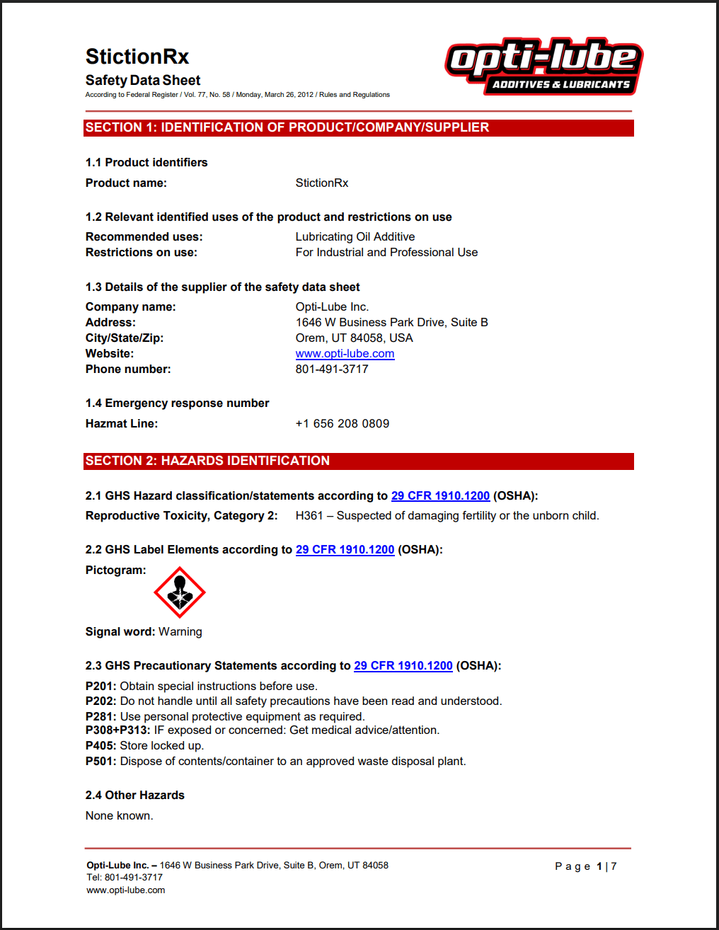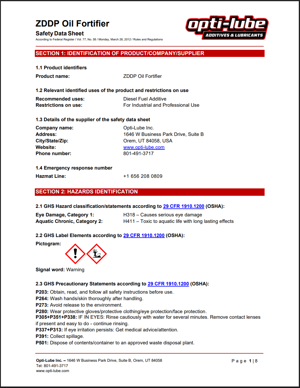 Oil Fortifier w/ZDDP SDS